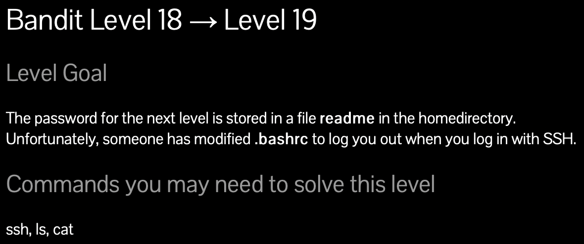 해석을 하자면, 다음 레벨의 비밀번호는 홈 디렉터리의 readme 파일에 있다. 하지만 ssh로 로그인을 하면 로그아웃이 되게끔 만들어 놨으니 쉘을 우회하거나 해봐라 이말이네여?? 바로 풀어보겠습니다.