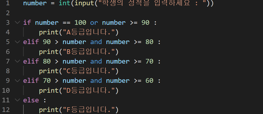 if ~ elif 조건문은 if ~ else와 비슷한 형태이지만, 조건이 여러개 일 때 사용할 수 있게 구현되어 있습니다. 홀짝 같은 2가지의 조건이아닌 학교 성적을 나눌 때 90점 ~ 100점은 "A" 80 ~ 90점은 "B"등급 .... "F"등급까지 조건이 여러개 일 때 구현됩니다. 학생 성적등급을 매겨주는 소스코드를 보고 알아봅시다!!