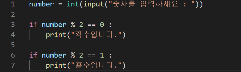 ② 첫번째 if 조건문에서 입력받은 number를 2로 나누었을 때 나머지가 0인 경우는 짝수이기 때문에 짝수입니다. 출력 짝수가 아닐경우 다음 조건문 실행합니다.