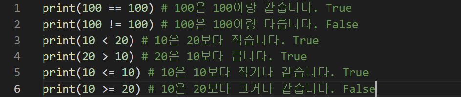 왼쪽 피연산자와 오른쪽 피연산자를 비교 연산자를 통해서 판별하면 0과 1이 아닌 True와 False로 출력됩니다.