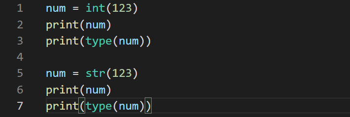 1행~3행은 num 변수를 int형으로 선언했지만 5~7행은 앞에 선언된 num변수를 str로 캐스팅 한 것 입니다.