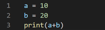 이 소스코드는 a라는 변수에 10이라는 데이터를 저장하고, b변수에 20이라는 데이터를 저장해줌으로써, a+b를 출력해주는 소스코드입니다. 쉽게 말해서 변수 a,b를 선언하고 값을 할당해줌으로써 변수에 저장된 값으로 연산까지 한 것입니다.