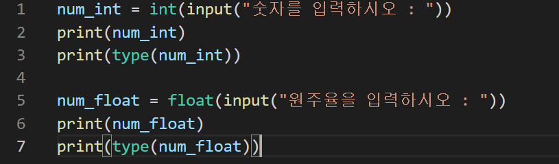 ② num_float라는 변수에 float형으로 캐스팅해준 입력을 받습니다. 그리고 6행에서 입력한 값을 출력하고 7행에서 입력한 값의 자료형을 출력합니다.