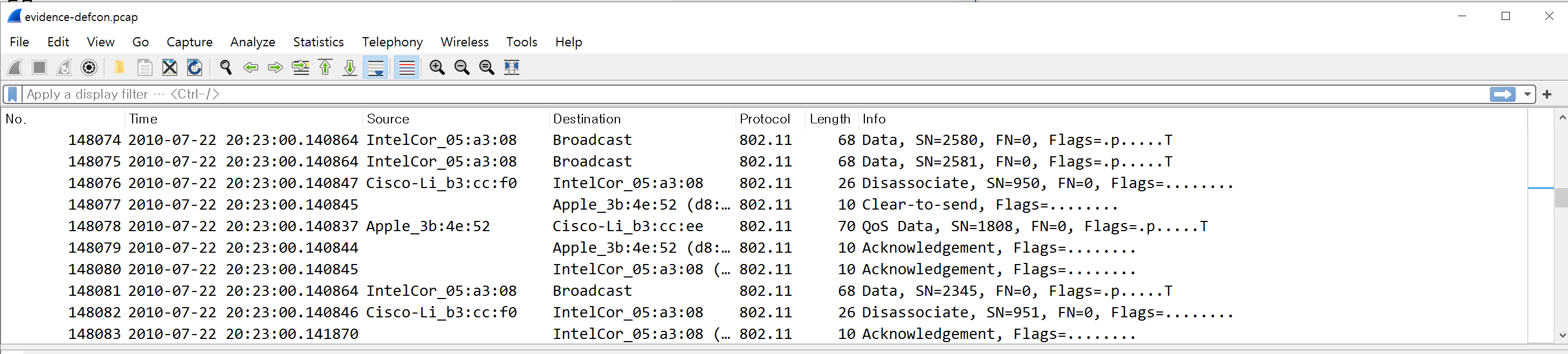 패킷들을 살펴보면 wep 프로토콜로 암호화가 된 것을 볼 수 있는데, 암호화가 된 패킷들은 크랙을 통하여 복호화를 시켜줘야 합니다.