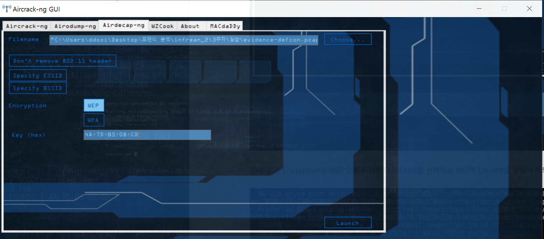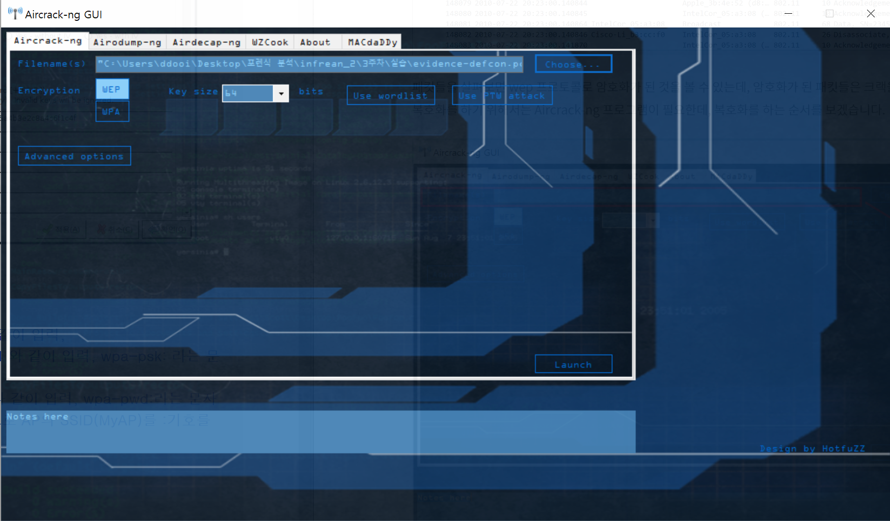 일단, wep를 복호화 하기 위해서는 키가 필요합니다. WEP 암호화 키는 64bit일 경우 01:02:03:04:05 와 같이 입력을 해야 하고, 128bit일 경우에는 0102030405060607080 이런식으로 키 값이 나오는 것을 볼 수 있습니다.