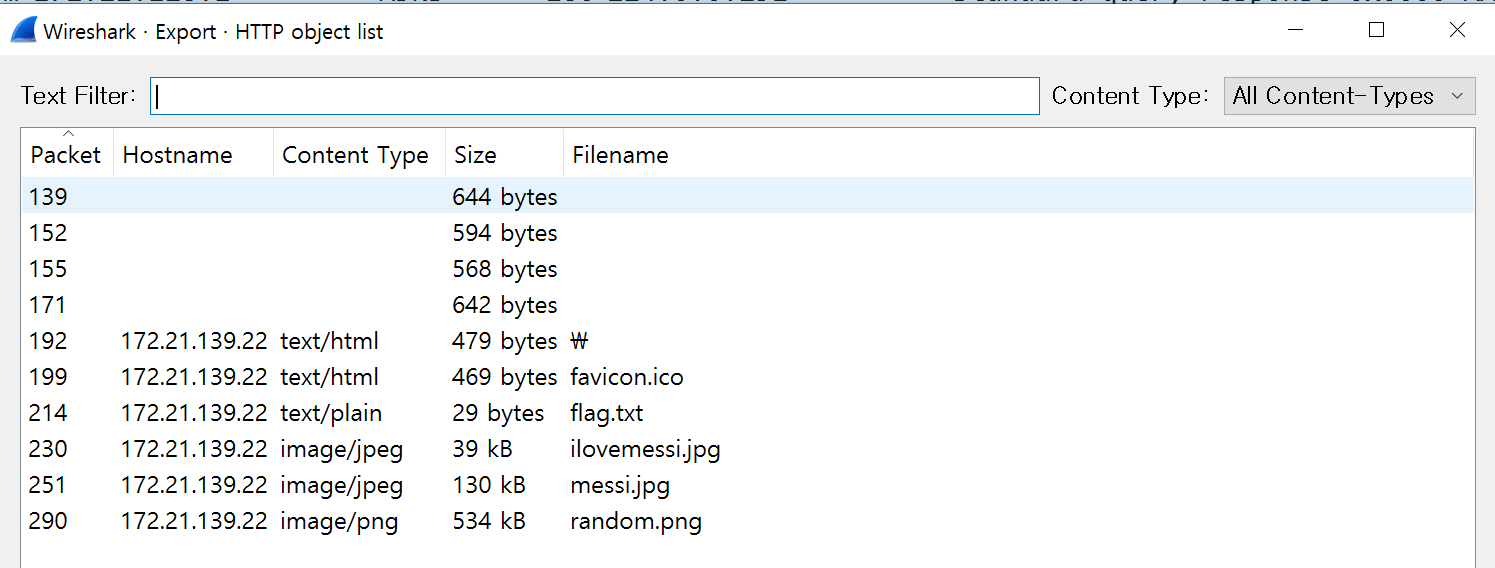 패킷을 열어, HTTP object list를 열어보니 flag.txt가 보이길래 해당 패킷에 가서 데이터를 봤습니다.