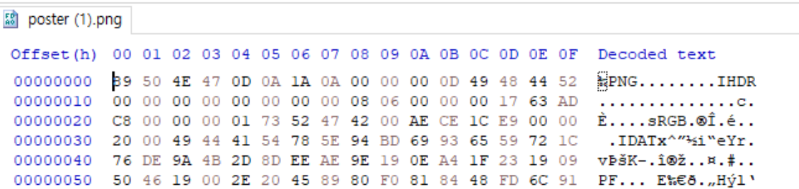 그래서 hxd에디터로 열어보니 시그니처랑 청크가 살짝 손상이 된 것을 볼 수 있었다.