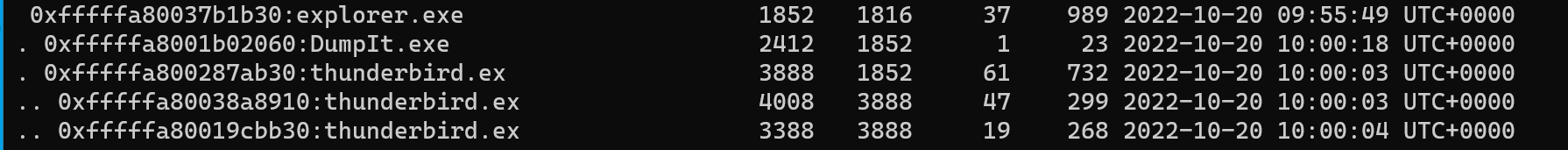thunderbird 프로세스 3개중 부모 프로세스가 3888로 된 프로세스라서 memdump를 통해서 3888 프로세스를 덤프떴다.