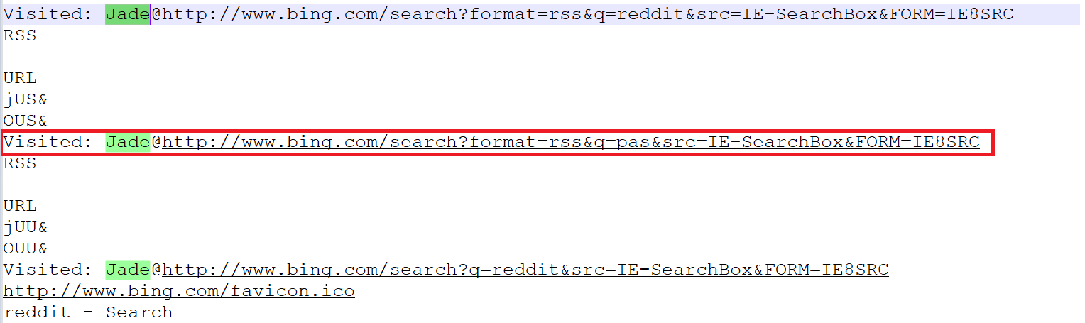 jade가 방문한 URL 정보이다. url을 따라가보면 reddit을 검색하고 pas를 검색하고 했던 정보들을 저장하고 있었다.