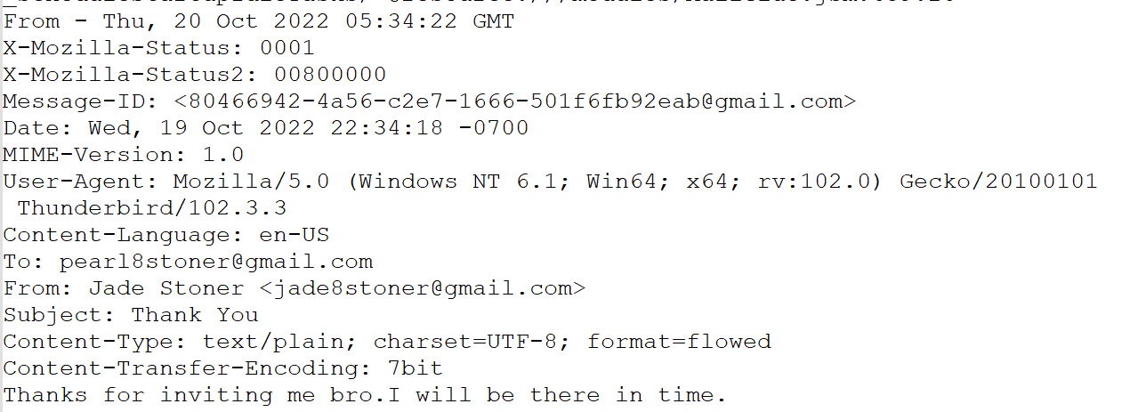 jade라는 키워드로 검색을 해본 결과, 이메일의 흔적을 볼 수 있었다. 하지만 중간에 조금 잘린 메일이기 때문에 원본 메일은 발견하지 못하였다.