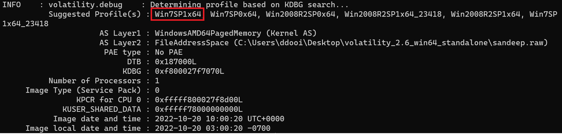 volatility_2.6_win64_standalone.exe -f sandeep.raw imageinfo