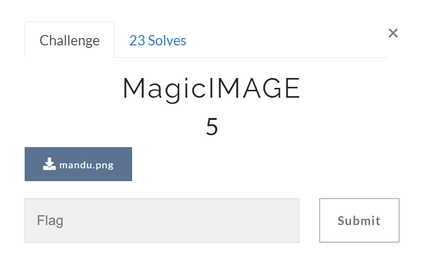 주어진 문제는 이것입니다. 제목이 MagiclMAGE이고 점수는 5점을 준다는 뜻입니다. 그리고 mandu-png 파일이 하나 주어지는데 그럼 저 png파일로 가지고 Flag값을 찾으면 될거라고 생각할 수 있습니다. 그럼 파일을 다운 받아보겠습니다.