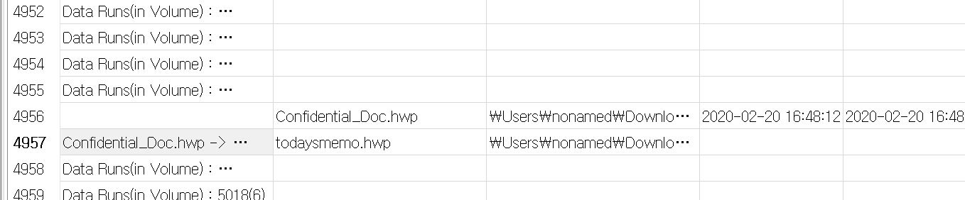 쭉 검색해서 내리다보면 파일명이 변경된 것을 확인할 수 있습니다. Confidental_Doc.hwp -> todaysmemo.hwp