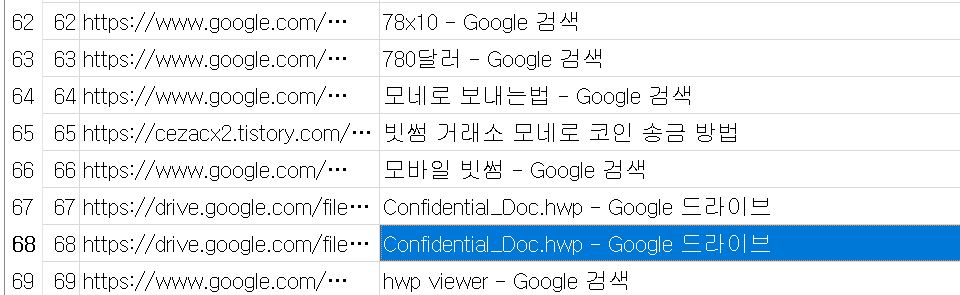 우리는 해당 사용자가 들어갔던 url을 분석을 한 결과 수상한 파일을 구글 드라이브에서 다운받은걸 확인할 수 있었습니다.Confidential_Doc.hwp 파일명부터 심상치가 않네요...비밀스러운 한글파일..!