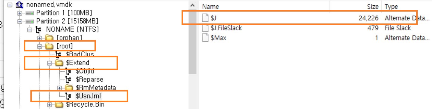 [root]\Extend\$UsnJrnl\$J 파일을 추출할 수 있습니다. 그림으로 보시면 이해가 되실겁니다.