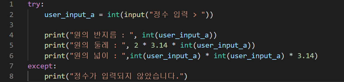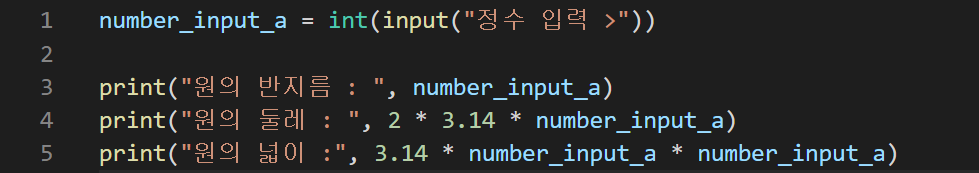 코드를 설명하겠습니다. 먼저 1행은 정수 입력을 받을 변수 number_input_a를 int형으로 변환시켜 입력을 받습니다. 즉 숫자를 입력 받으면 정수형으로 변환시켜서 받는다는것이겠죠?? 그럼 이 프로그램을 작성한 개발자는 당연히 원의 넓이 둘레를 구하는줄 알고 숫자만 넣겠지?? 라고 생각을 할것입니다. 이런식으로 말이죠