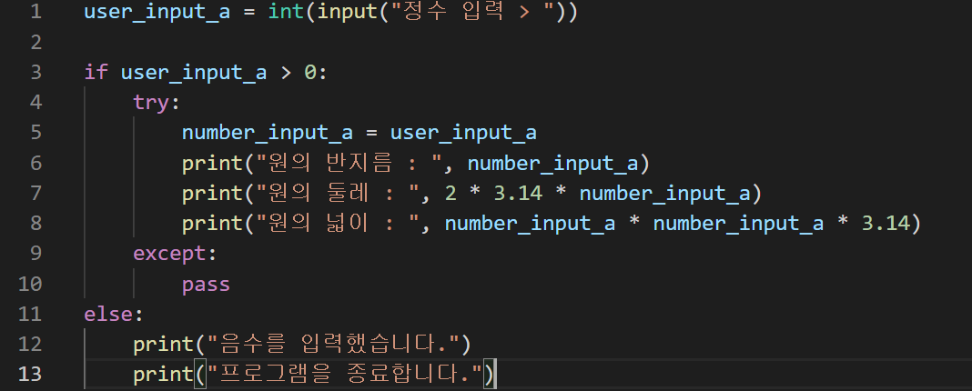 이처럼 조건문으로도 할 수 있고, try execpt문으로도 할 수 있습니다. 하나의 예외 처리를 더 해볼까요?? 도형은 음수가 존재하지 않습니다. 음수를 입력할 경우 예외 처리하는것을 보여드리겠습니다. 이번에는 if try except else를 써볼게요!!