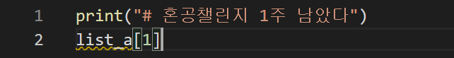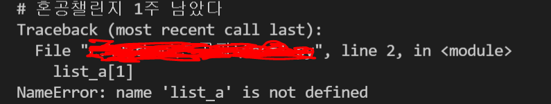 1행은 출력이 되는것이 보일것 입니다. 하지만 바로 Traceback(moast recent call last)란 오류를 발생시킵니다. 이건 우리가 호출한 부분을 역추적하라는 의미입니다. 오류를 읽어보면 line 2, in <module> list_a[1]은 파일의 2행에 오류가 있다는 것을 의미하고 오류를 발생시킨 코드가 list_a[1] 라고 설명을 하는것입니다. NameError는 말 그대로 list_a가 정의되어 있지 않다는 말이니까 오류를 해결하려면 list_a = [1,2,3,4,5] 이렇게 정의를 해주면 되겠죠?? ㅎㅎㅎ